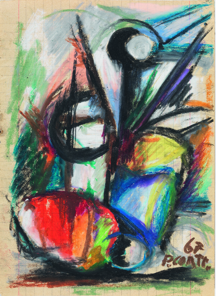 Primo Conti COMPOSIZIONE ASTRATTA Pastello policromo su carta di quaderno a quadretti. Mm 205x148. Firmato e datato “67”.
