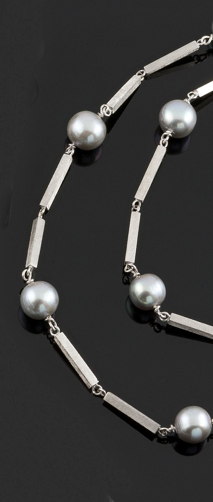 Collana composta da perle di acqua dolce alternate a segmenti rigidi satinati in oro bianco