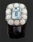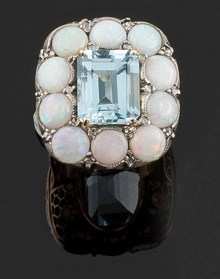 con al centro topazio azzurro di taglio rettangolare contornato da dieci sfere in opale