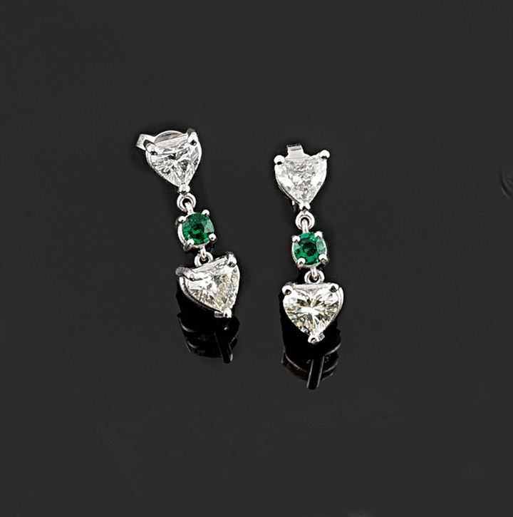diamanti taglio a cuore per complessivi ct 1,70 ca e due smeraldi di taglio rotondo per ct 0,27 ca