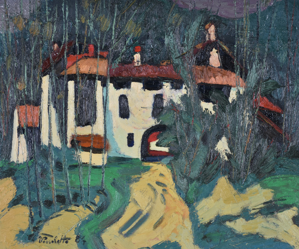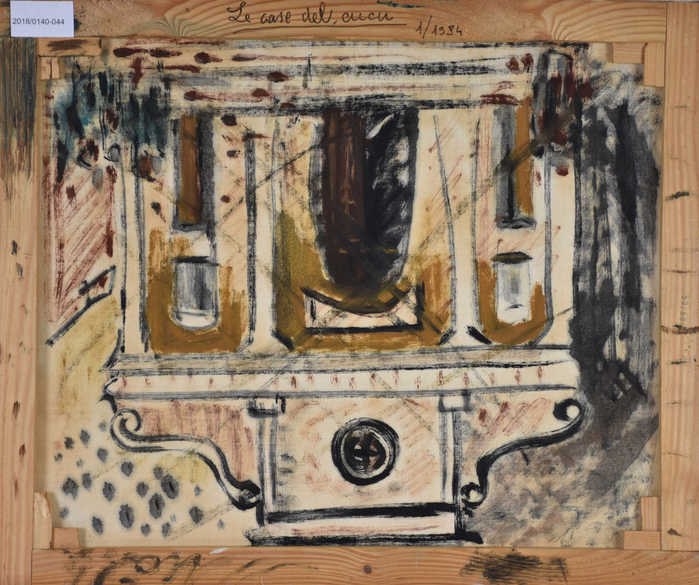 Alberico Verzoletto Le case del cucù olio su tela, cm 50x60 sul fronte: firma e data sul retro: titolo e data eseguito nel 1984 L'opera presenta un altro dipintoal retro della tela