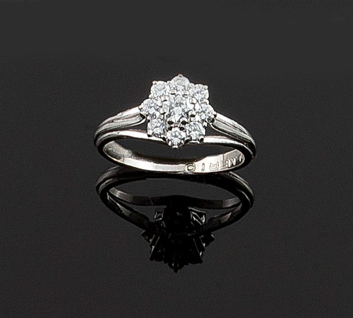 Anello in oro bianco, firmato "Palmerio", a forma di fiore con nove diamanti taglio brillante