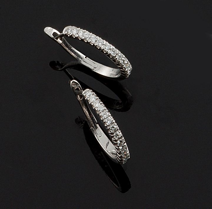 Coppia di orecchini in oro bianco, firmati "Bliss", a forma di cerchio, parte anteriore con diamanti taglio