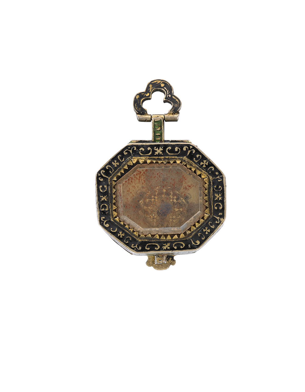 Orologio da tasca da donna in argento a forma di bauletto decorato con smalti policromi