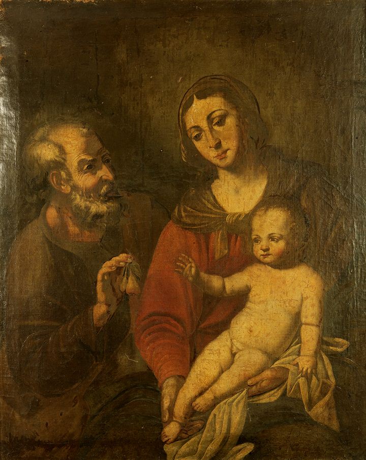 PITTORE ANONIMO DEL '600 "Sacra Famiglia" 100x84 olio su tela Restauri