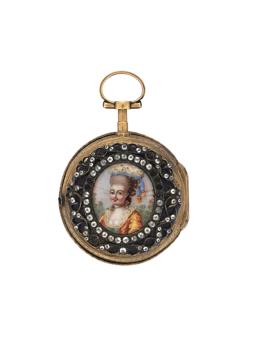 ROMILLY A PARISOrologio da tasca da donna in oro 18K decorato con miniatura...