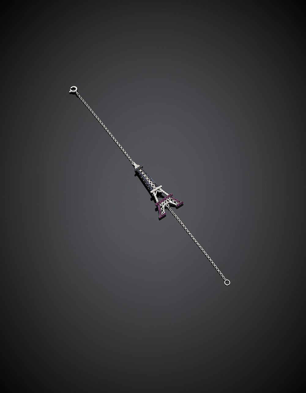 Bracciale in oro bianco con Tour Eiffel rifinita in diamanti rubini e zaffiri, g 3,12, lungh. cm 16,5 circa.