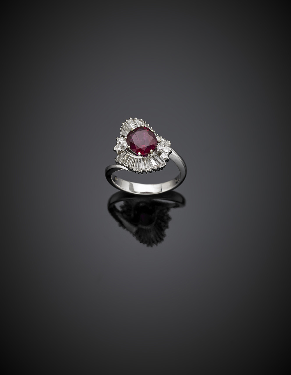 Anello in oro bianco con diamanti rotondi e baguette a contornare un rubino ovale di ct. 2,10 circa, g 7,02 misura 17/57.