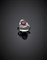 Anello in oro bianco con diamanti rotondi e baguette a contornare un rubino...