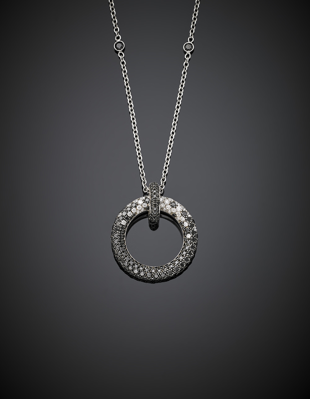 Catenina a rolò in oro bianco a sostenere un pendente ad anello con pavé di diamanti neri e incolori per complessivi ct. 1,56 circa, g 13,38, lungh. cm 50, largh. cm 2,7 circa. Garanzia originale