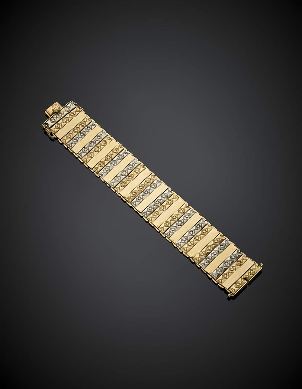 Bi-coloured gold articulated band bracelet, g 48.63, length cm 19, width cm 2.7 circa.