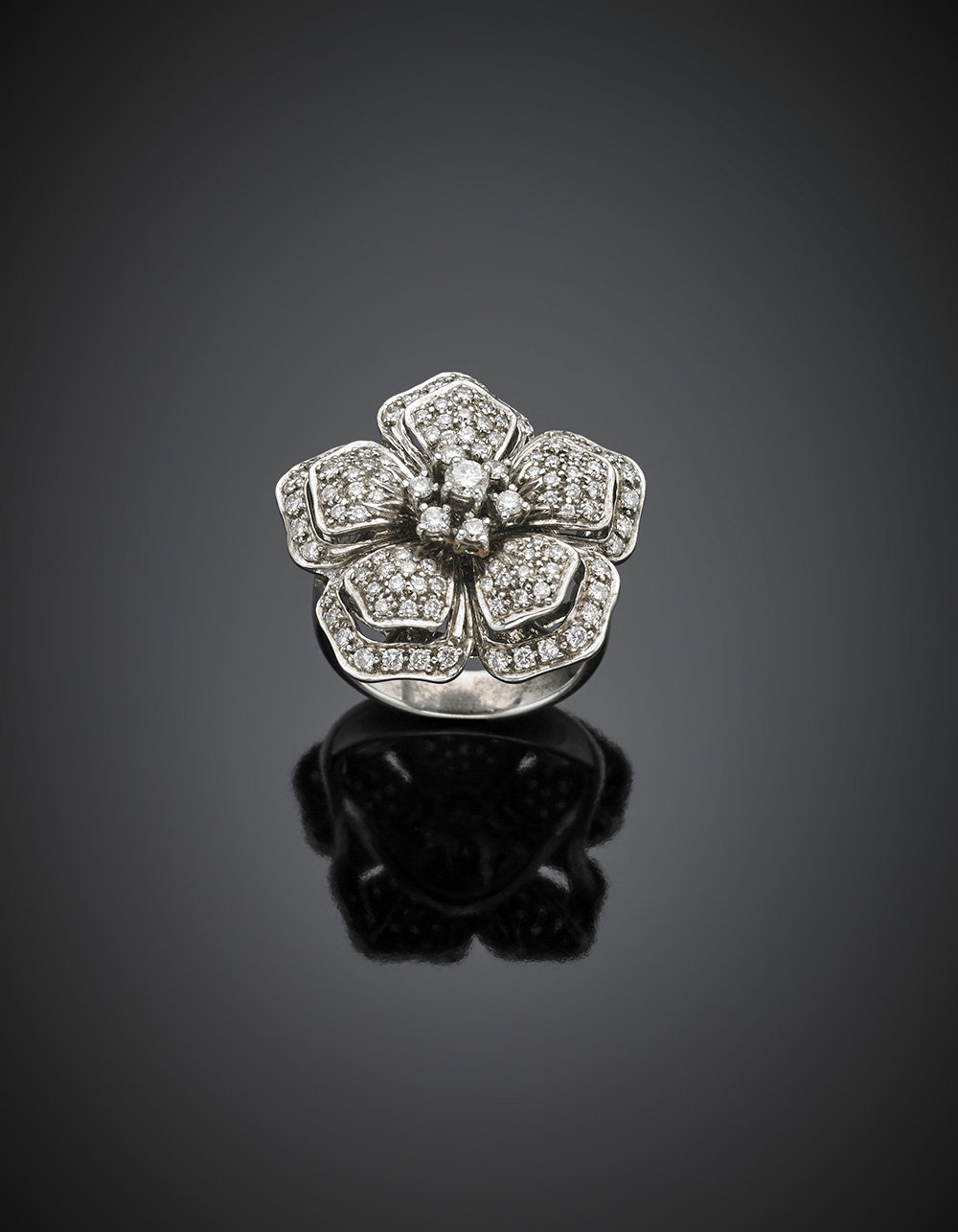 Anello a fiore in oro bianco e diamanti rotondi, g 16,73 misura 18/58. Marcato all'interno CJ126.