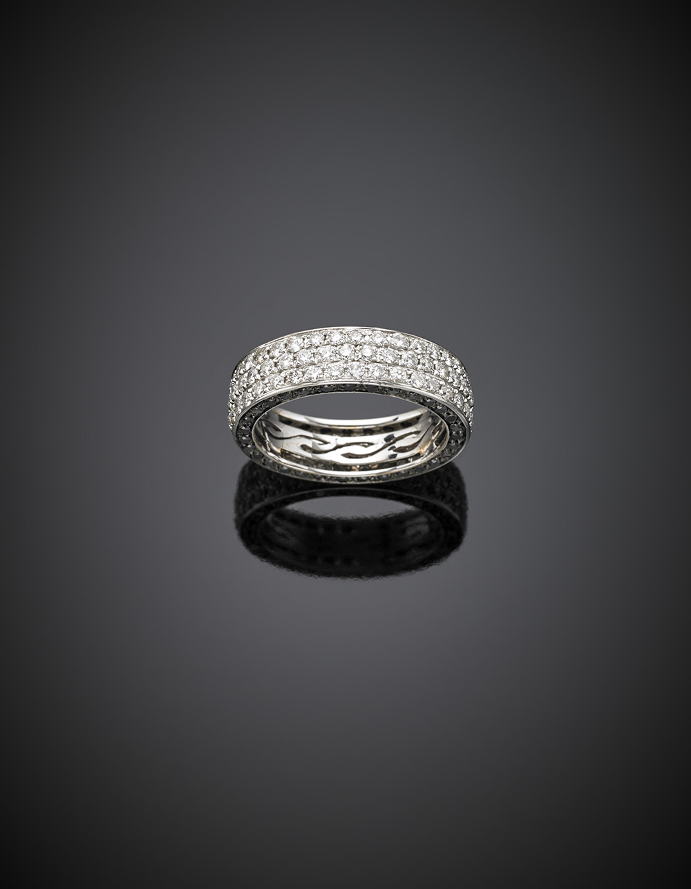 Anello fascia in oro bianco con tre file di diamanti rotondi, lateralmente rifinito in oro rodiato nero e diamanti rotondi neri, per complessivi ct. 2,78 circa, g 5,75 misura 14/54. Garanzia originale