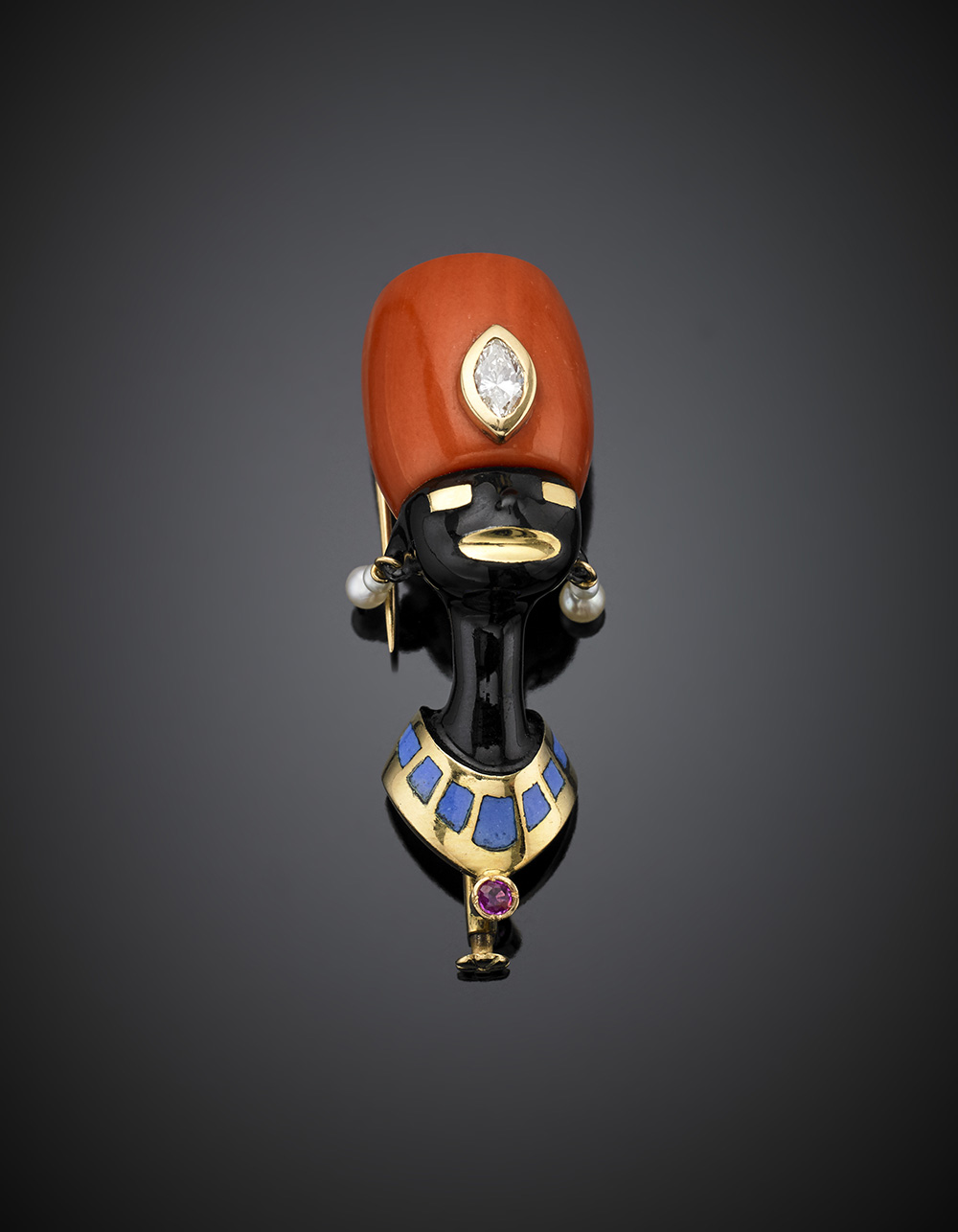 Broche a guisa di moro in oro giallo rifinito con smalti, un diamante a navette, un rubino rotondo e un corallo a barilotto, microperle a disegnare gli orecchini, g 14,25, lungh. cm 4,20 circa.