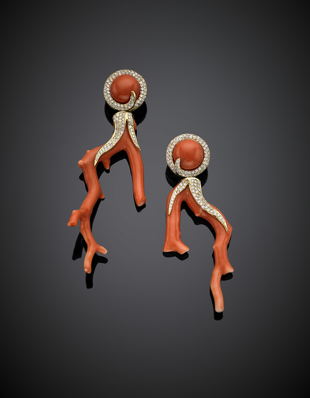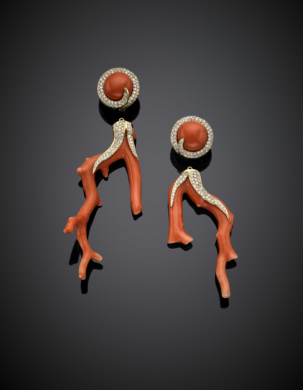 Lotto 737 | Orecchini pendenti in oro giallo con diamanti e coralli arancione a rametto e...