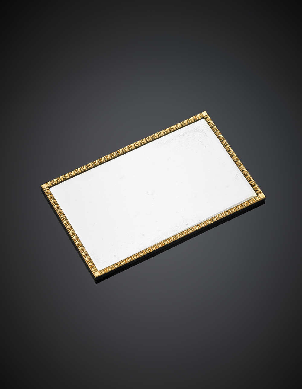 *Specchio con cornice in oro giallo cesellato e sbalzato, lordi g 76,78, lungh. cm 9,90, largh. cm 6,20 circa.