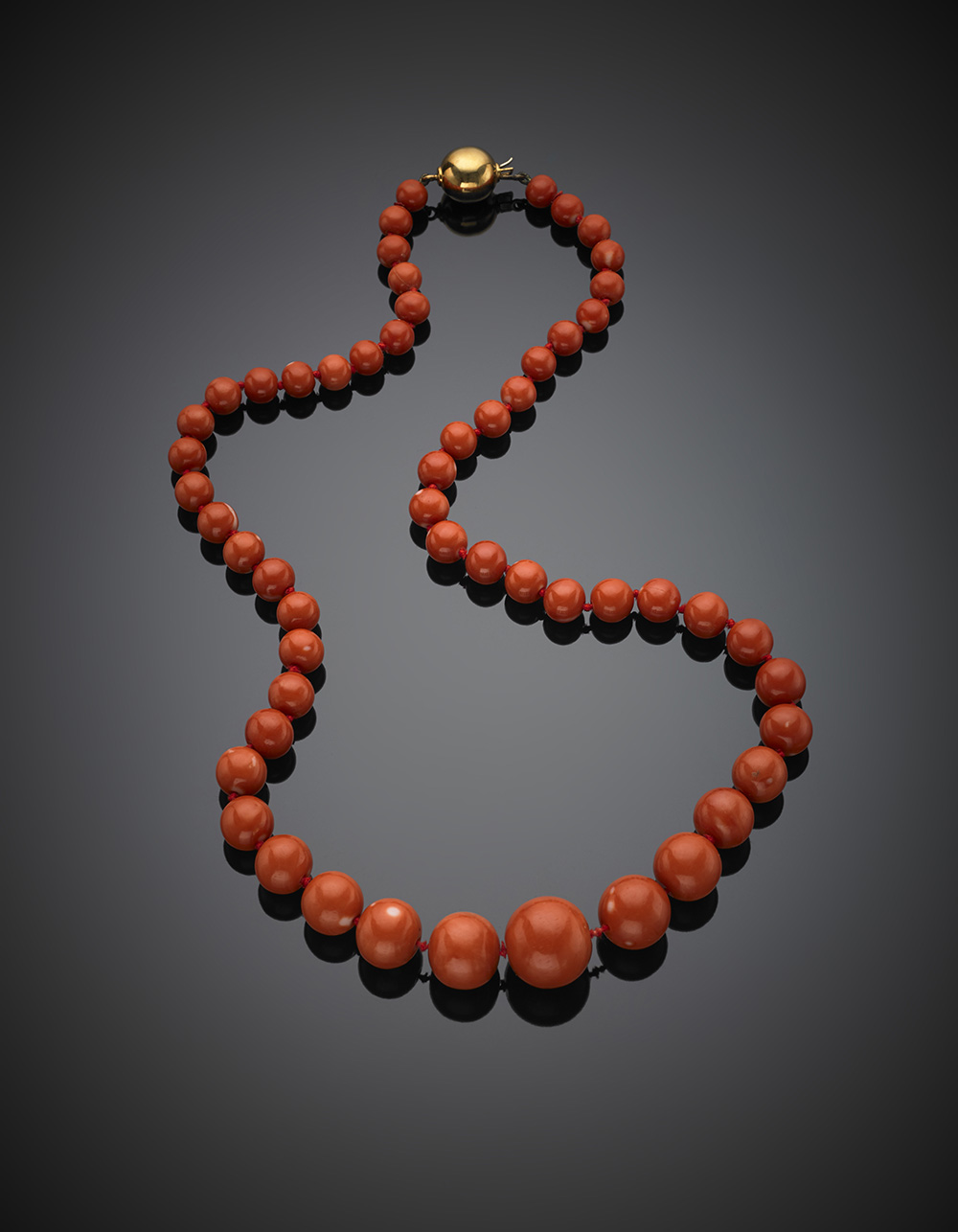Red orange coral graduated bead necklace with yellow gold clasp, bead diam from mm 8.30 to mm 20.60 circa, g 117.83.