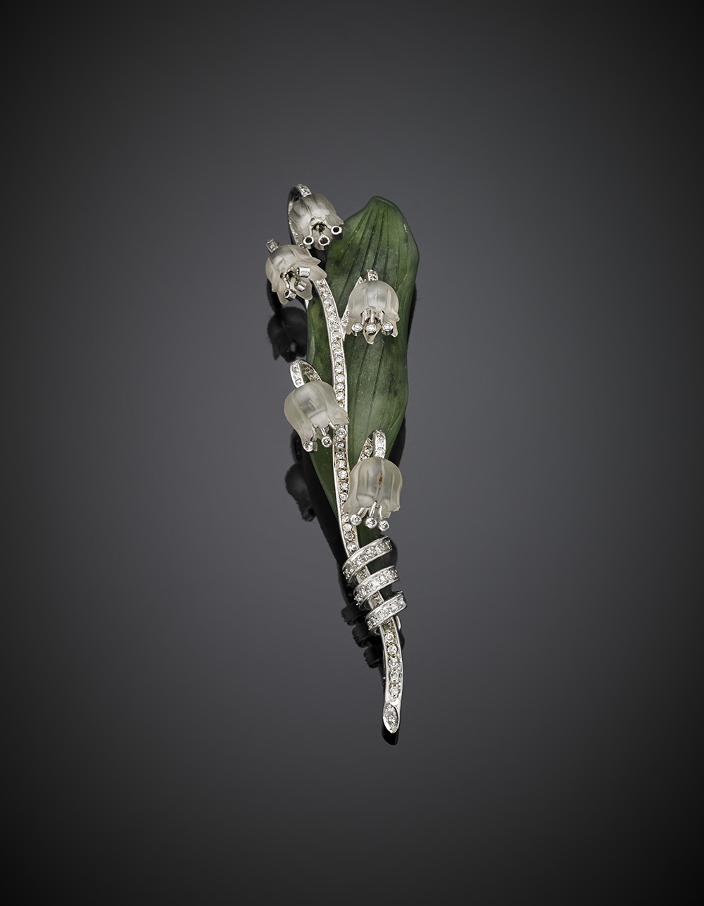 Carved hyaline quartz, nephrite and diamond lily of the valley white gold brooch, g 15.97, length cm 8.50 circa.