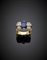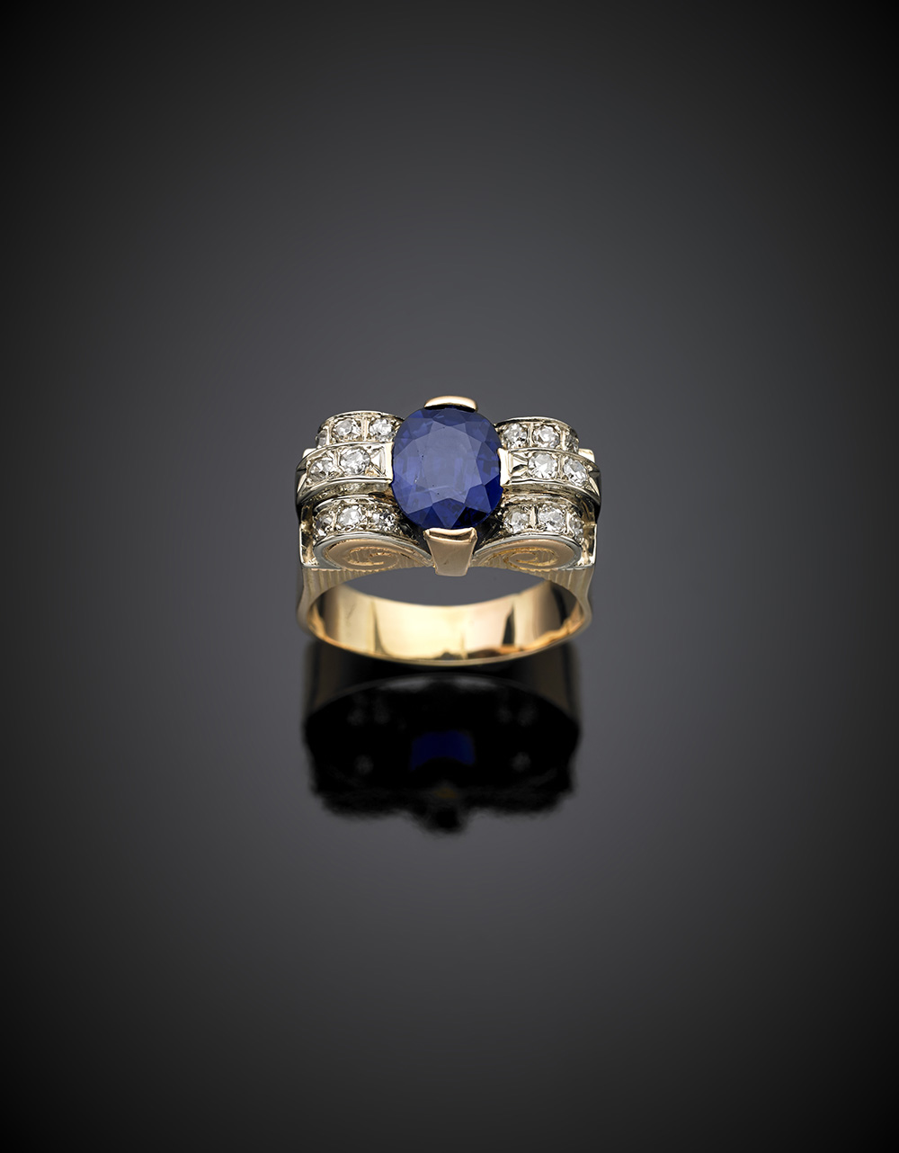 Anello a cartigli in oro giallo e bianco con diamanti rotondi ed al centro uno zaffiro ovale di ct. 3,20 circa, g 10,03 misura 21/61.