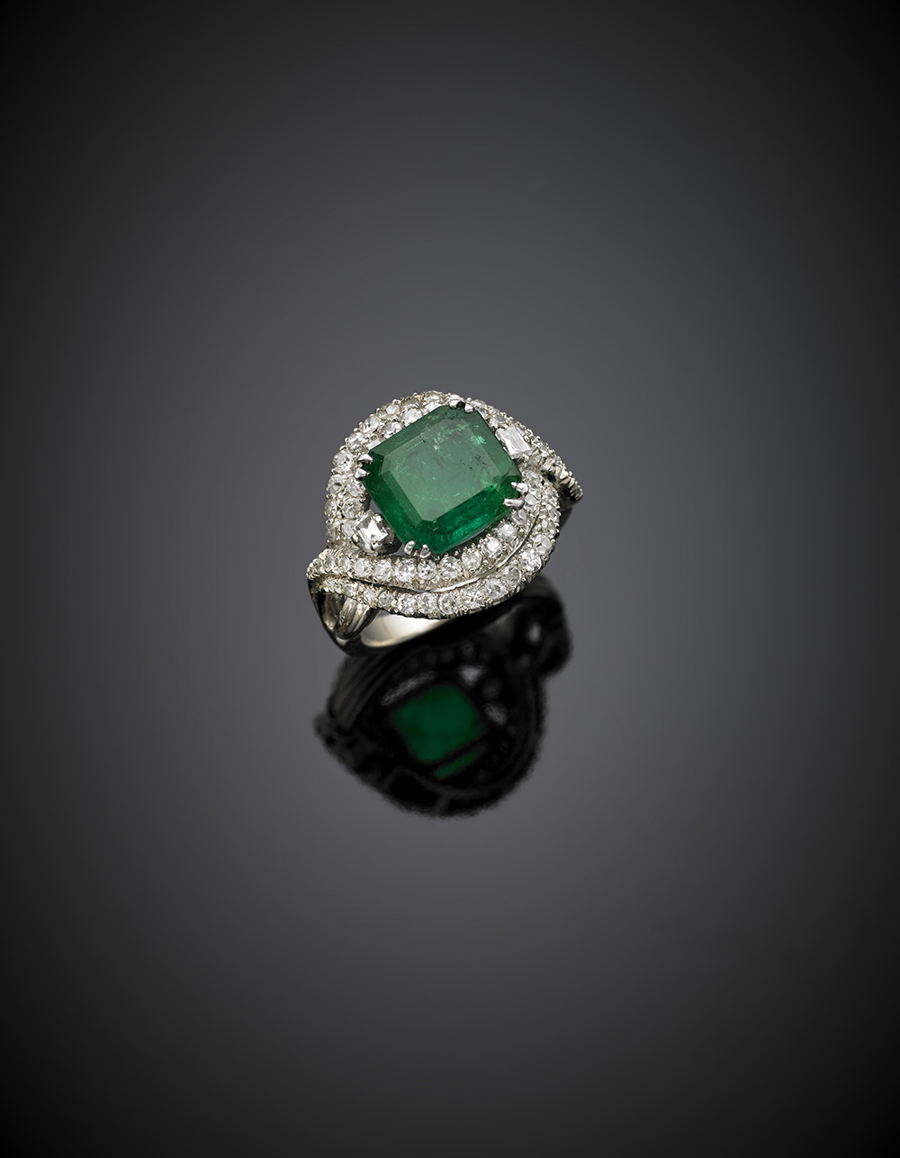 Anello in oro bianco con smeraldo di ct. 2,40 circa tenuto da intreccio di diamanti, g 7,22 misura 11/51.