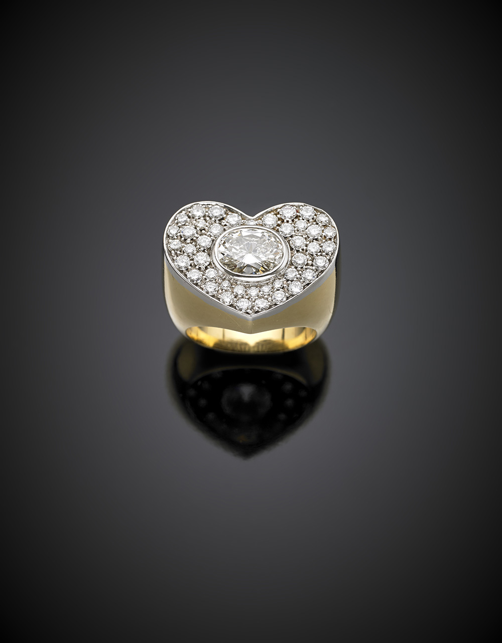 Anello a cuore in oro giallo e bianco con diamante centrale di ct. 1,50 circa e diamanti a pavè per complessivi ct. 1,30 circa a rifinirlo, g 14,14 misura 12/52.