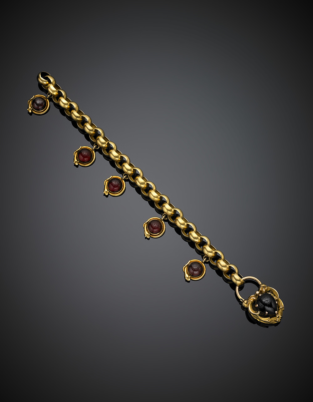 Bracciale in oro giallo a catena con charms in granati cabochon, g 37,62, lungh. cm 19,20 circa.