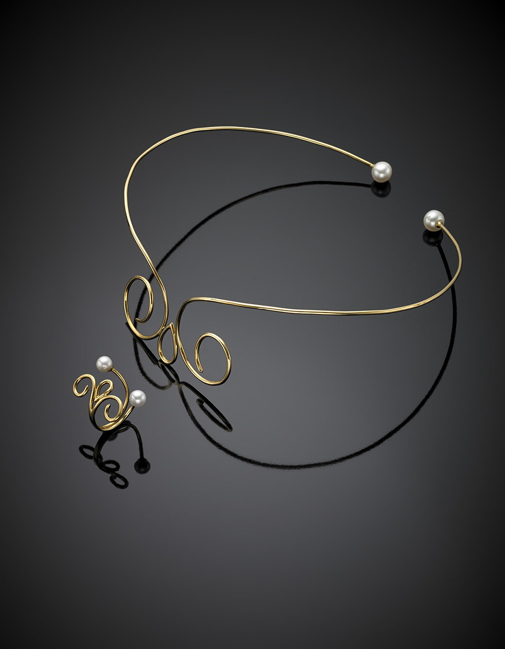 Yellow gold jewellery set comprising wire necklace accented on the back with spirals with white mm 8.85 circa pearls and a similar ring, in all g 26.49, diam. cm 14 size 13/53. Original Guarantee