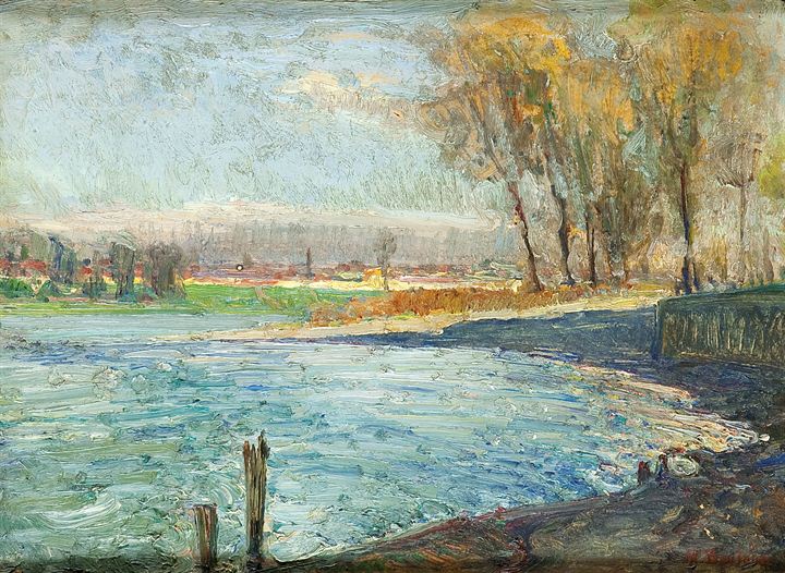BERTOLA MARIO Torino 1880 - 1926 "Al lago" 29x40 olio su cartoncino Opera...