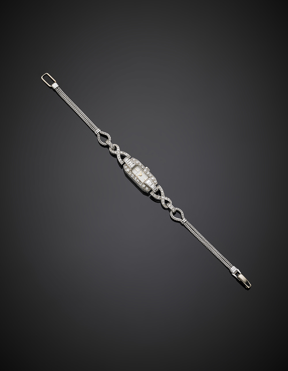 Orologio da polso da donna, in platino e oro bianco 585/1000 con diamanti rotondi e a baguette g 19,34, lungh. cm 18 circa.