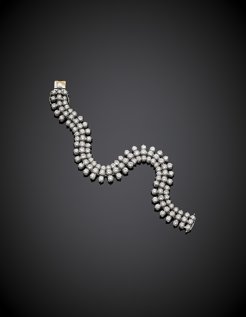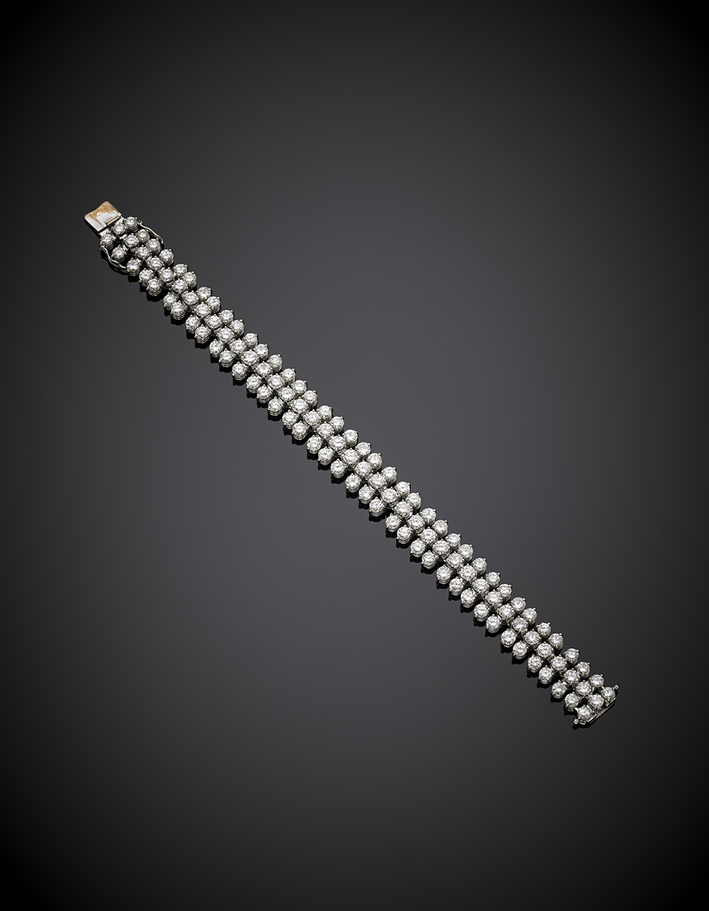 Bracciale in oro bianco a tre file di diamanti rotondi per complessivi ct. 19,00 circa, g 28,90, lungh. cm 18,40, h cm 1,30 circa.