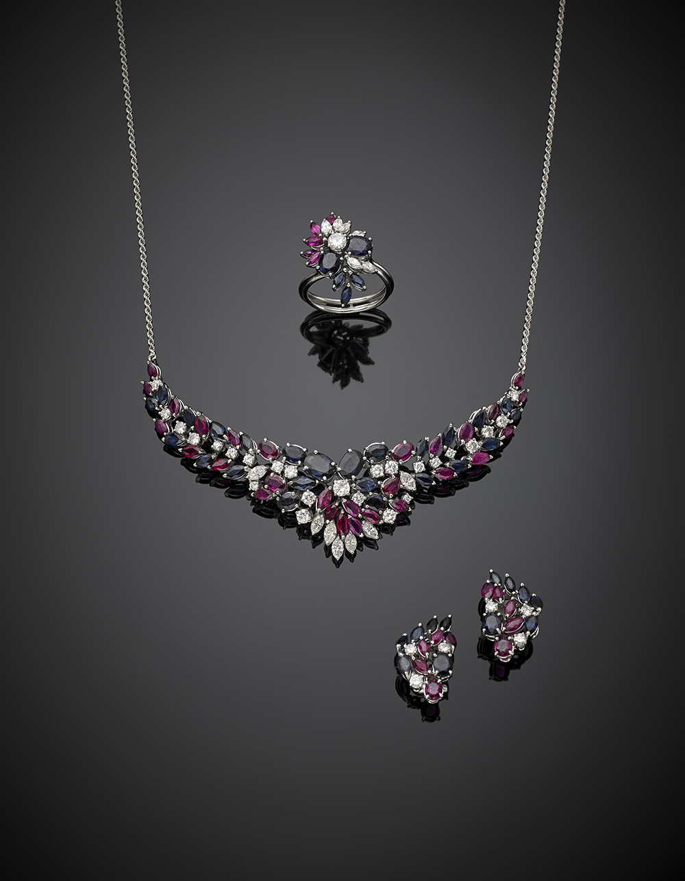 Demi parure in oro bianco con diamanti zaffiri e rubini composta da collana...