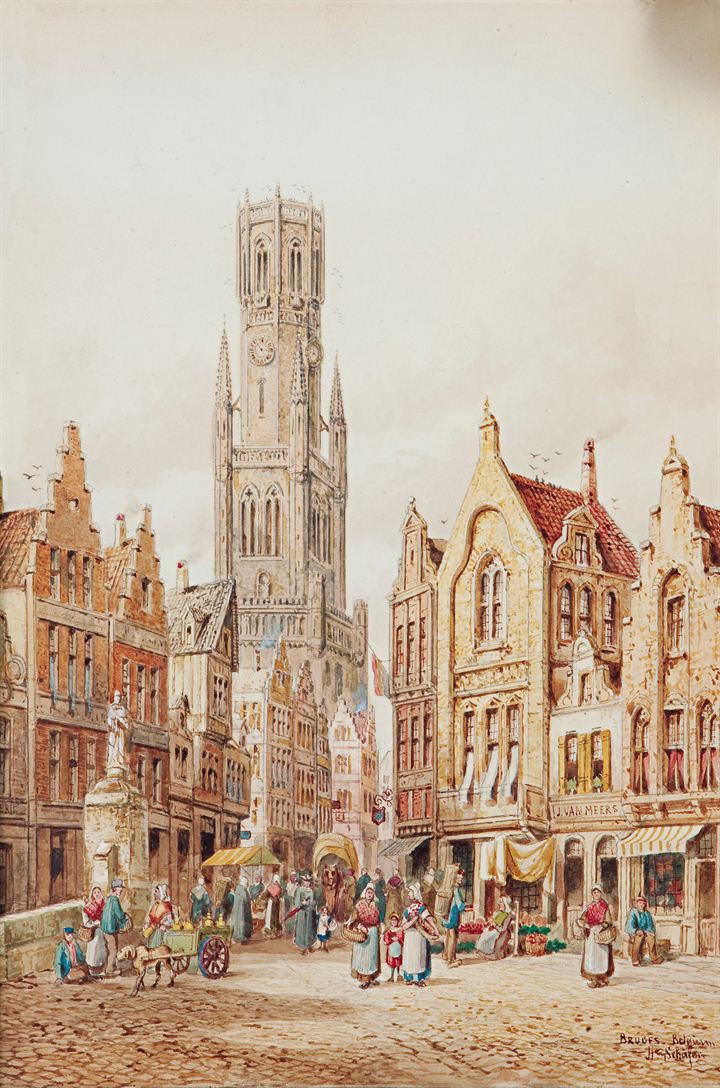 SCHAFER HERMANN 1880-? "Veduta della città di Bruges" 48x32 acquerello su...