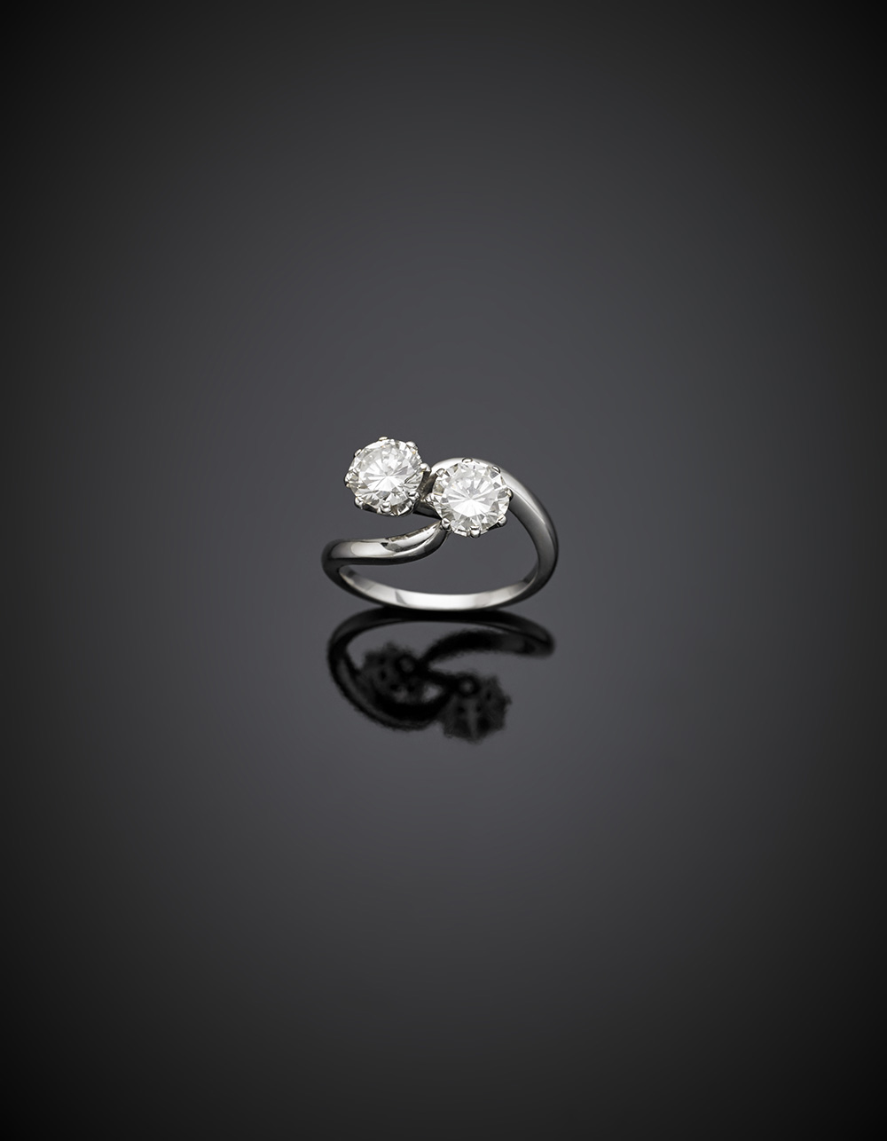 Anello in oro bianco a contrariè con due diamanti rotondi di ct. 0,93 circa e di ct. 0,91 circa, g 4,75 misura 13/53. Accompagnato da garanzia di Schreiber, 4/4/70