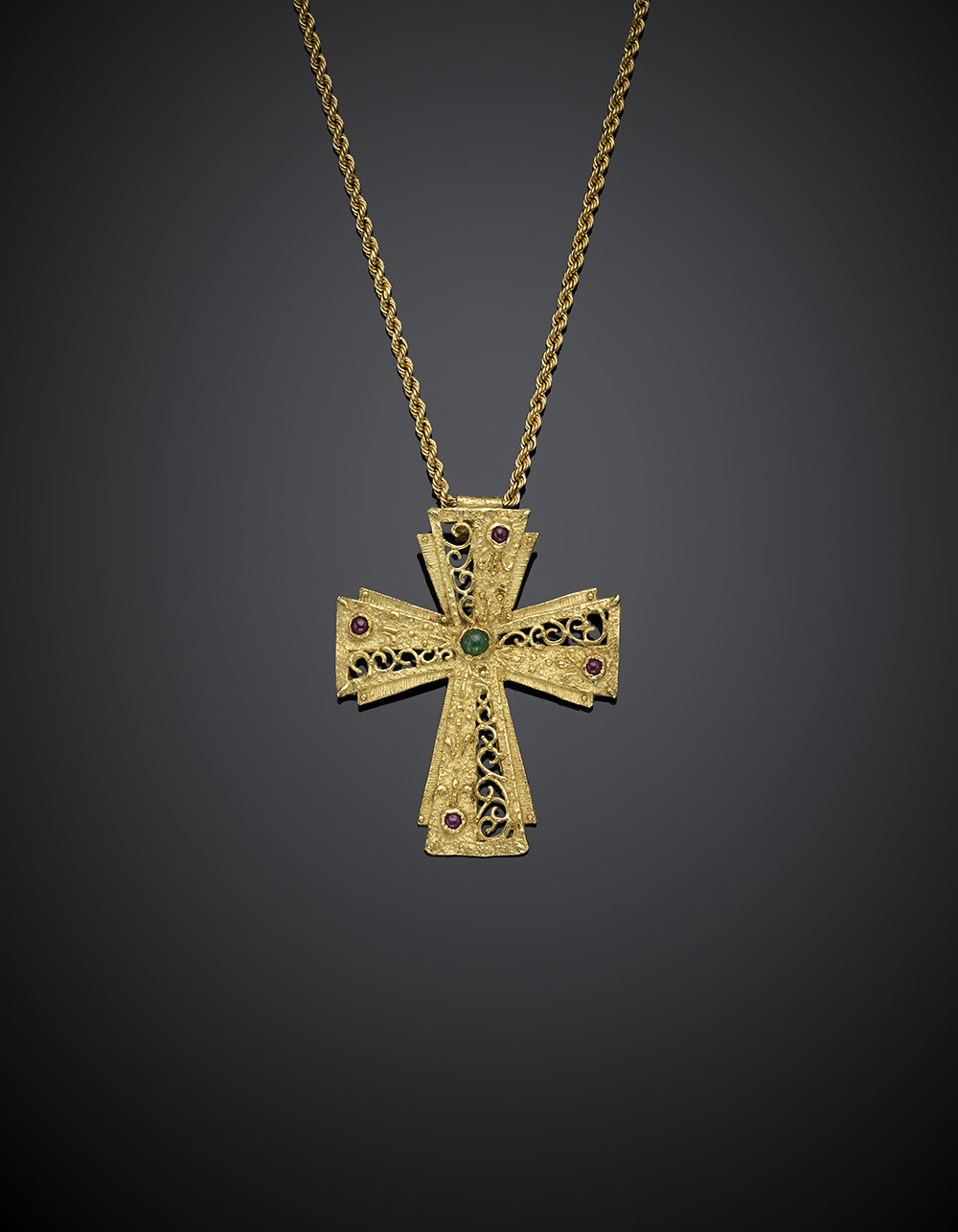 Catena con pendente a guisa di croce rifinito in smeraldi e rubini cabochon, il tutto in oro giallo, lungh. pendente cm 4.8, g 13,83, lungh. cm 50 circa.