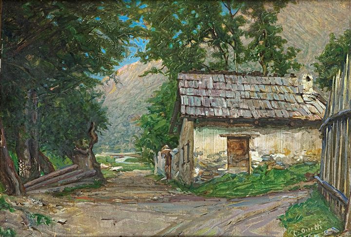 ONETTI LUIGI Lù (AL) 1876 - 1968 Torino "Case a Bardonecchia" 1928 23x33 olio...