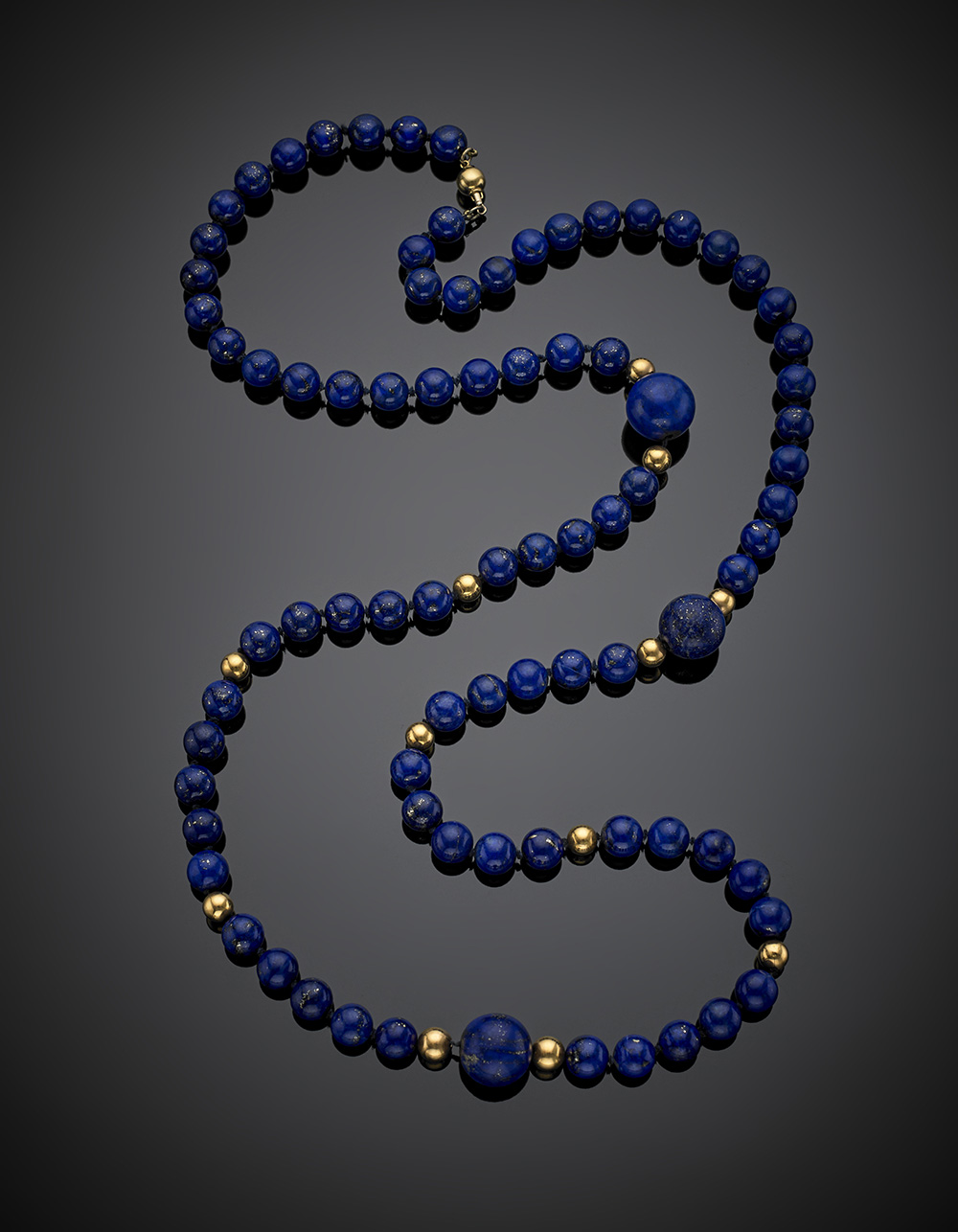 Collana in boules di lapislazzuli da mm 9,90 a mm 17,75 circa, chiusura e distanziatori a boule in oro giallo, g 160,6, lungh. cm 110 circa.