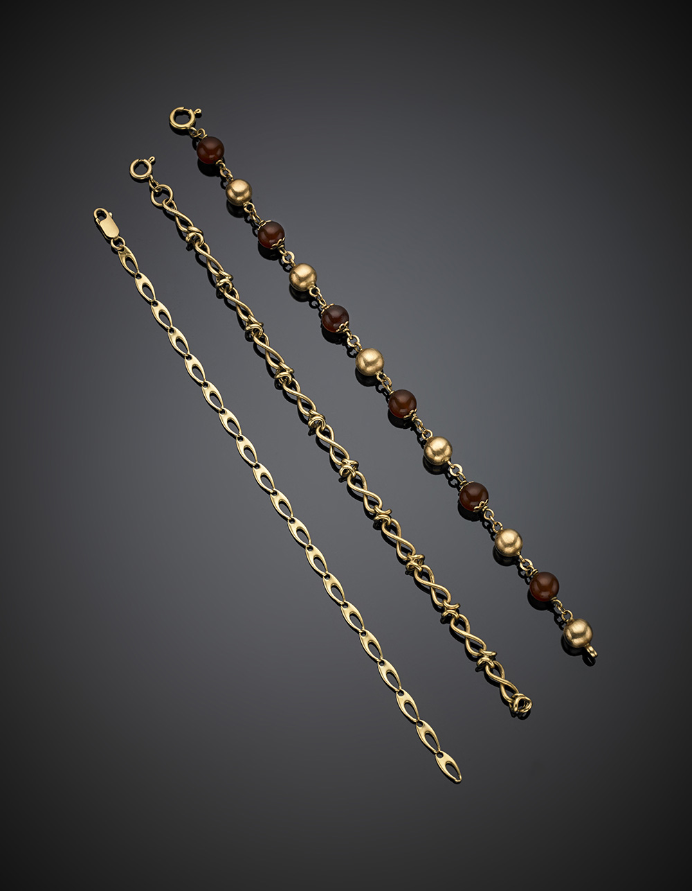 Tre bracciali a catena in oro giallo, uno con corniole e boules d'oro...