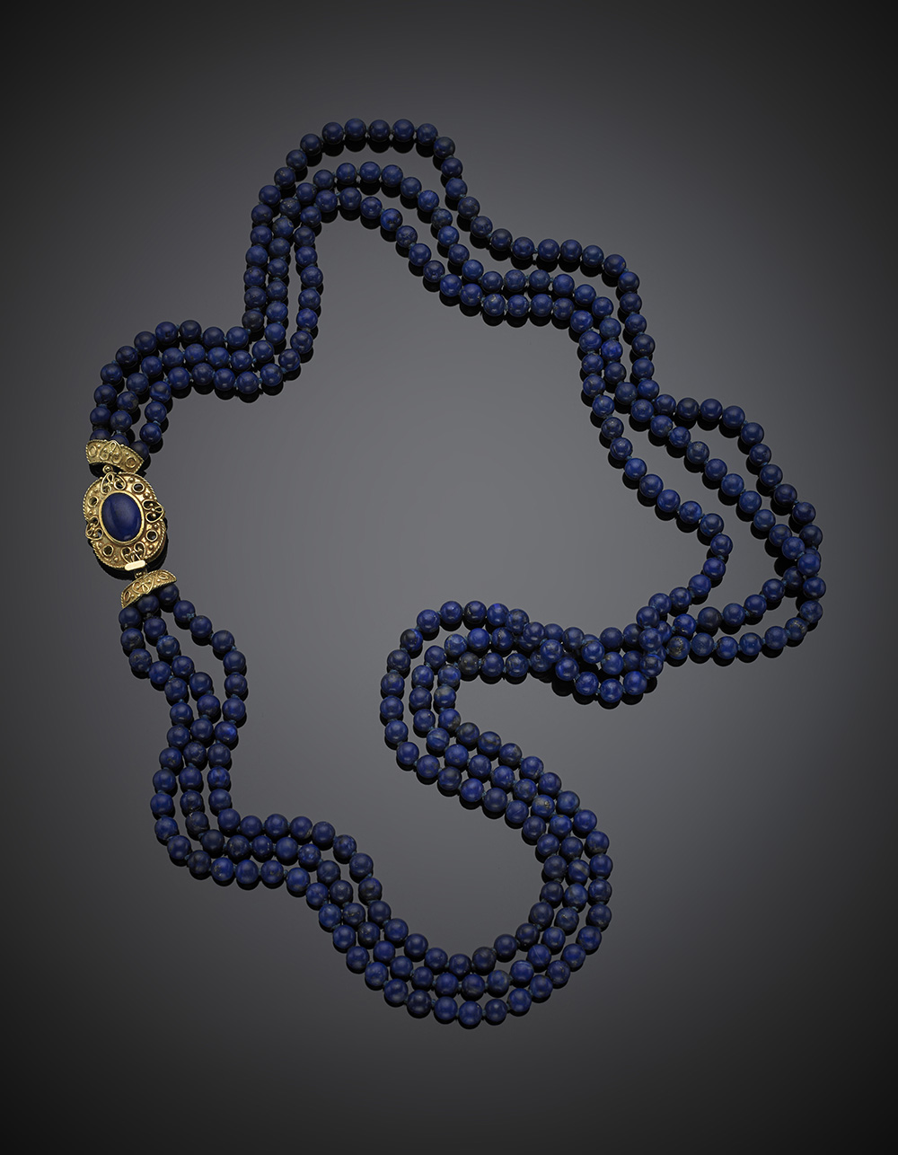 Collana a tre fili in boules di lapislazuli e sodalite con chiusura in oro giallo e lapis ovale cabochon, g 121,24, lungh. cm 74 circa. (lievi difetti)