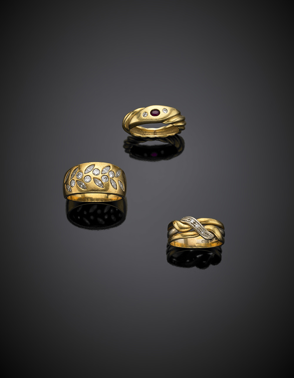 Lotto di tre anelli in oro giallo e bianco rifiniti con diamanti e un rubino,...
