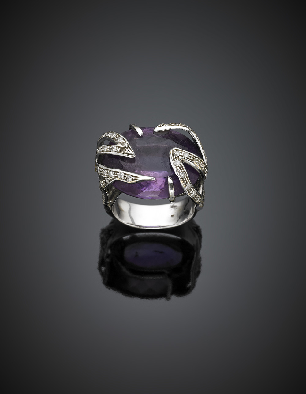Anello in oro bianco e diamanti a tenere un ametista ovale di ct. 26 circa, g...