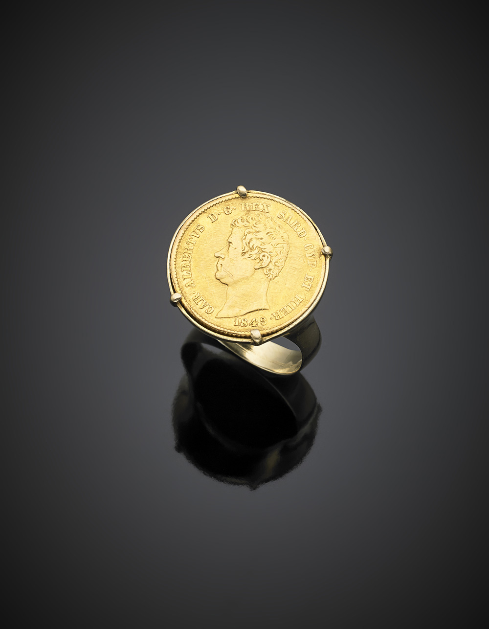 Yellow gold ring with Carlo Alberto coin, g 14.82 size 24/64.
