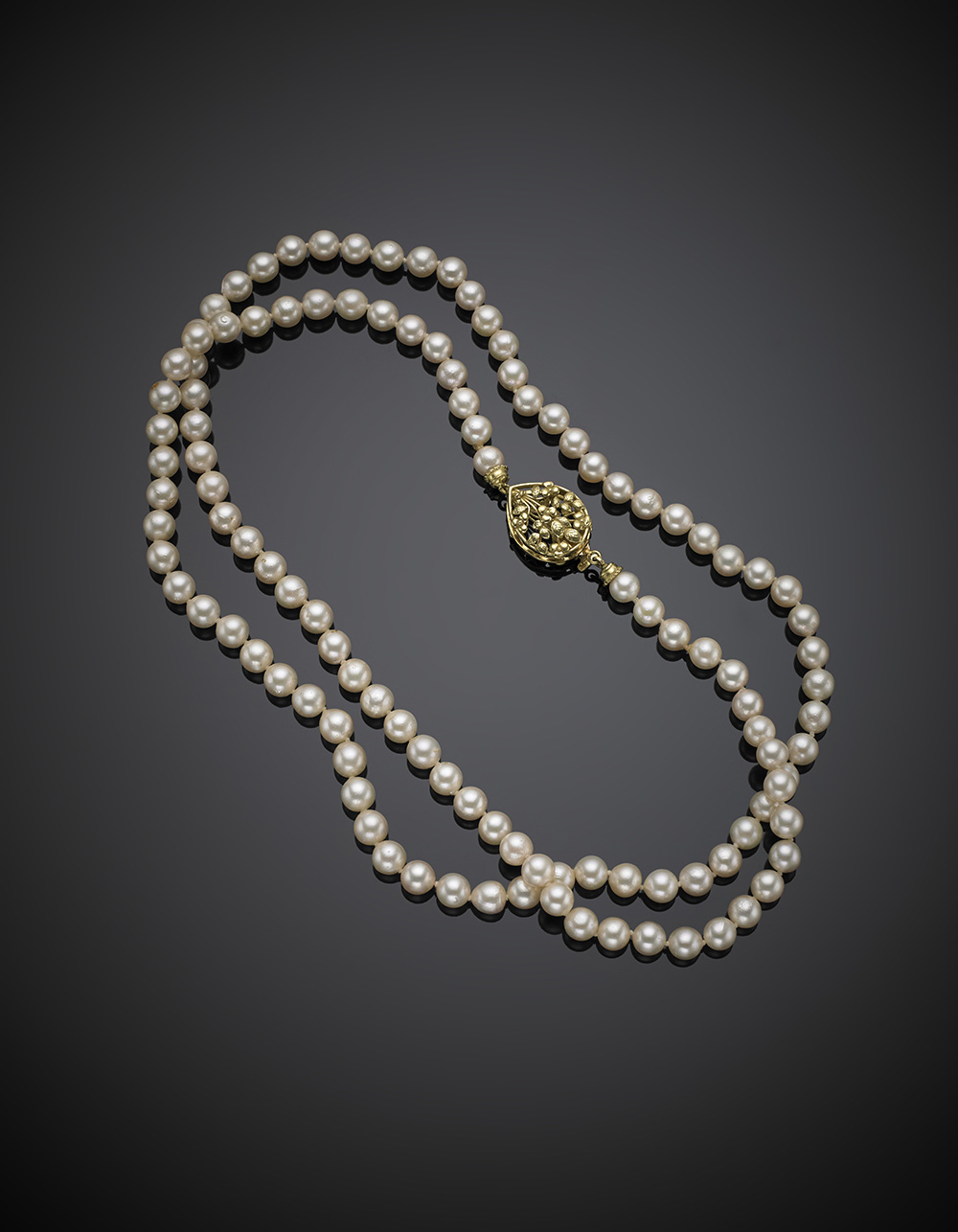 Collana lunga di perle bianche coltivate con chiusura in oro giallo, g 66,87, lungh. cm 92 circa.