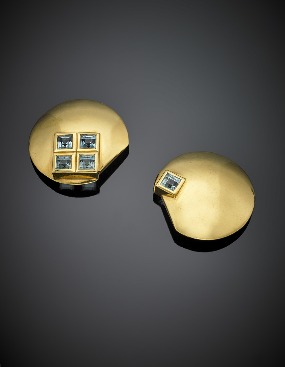MANFREDIOrecchini a lobo in oro giallo e topazi azzurri carré, g 20,92, diam....
