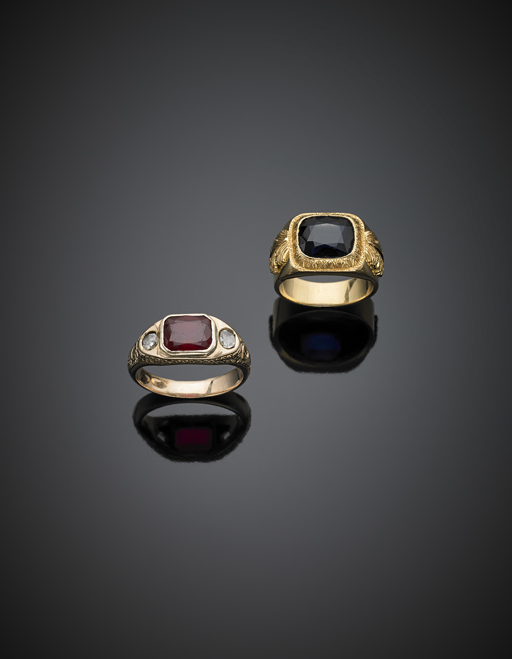 Due anelli in oro con paste vitree e corindone sintetico, complessivi g 21,31...