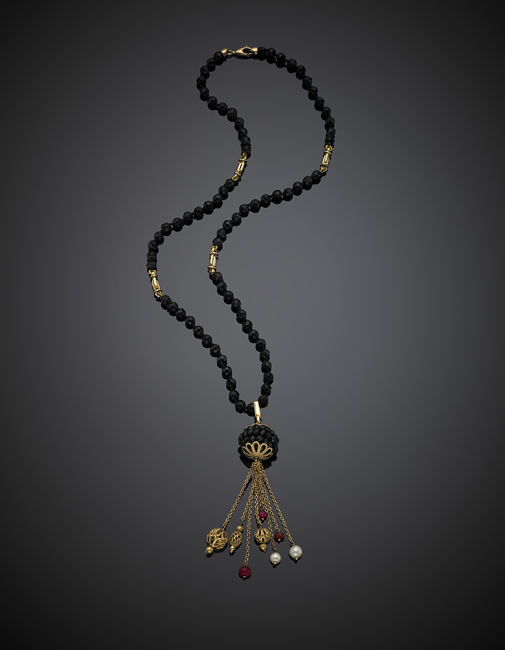 Collier in onice sfaccettata ed oro giallo con pendente rifinito in oro, perle e rubini, lungh. pendente cm 7,3 g 17,29, lungh. cm 45 circa.