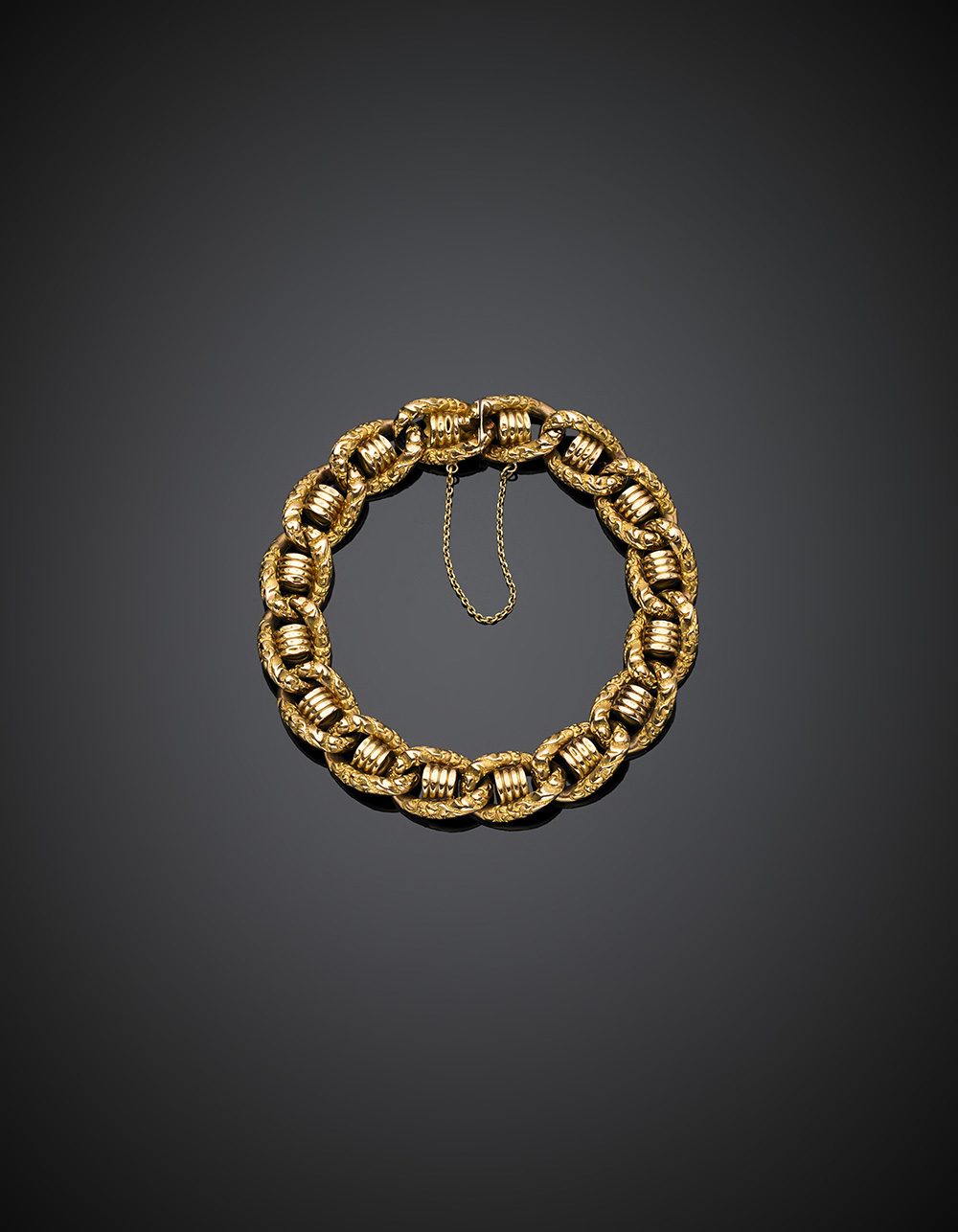 Bracciale a maglia sbalzata e incisa in oro giallo rossastro, g 21,74, lungh....