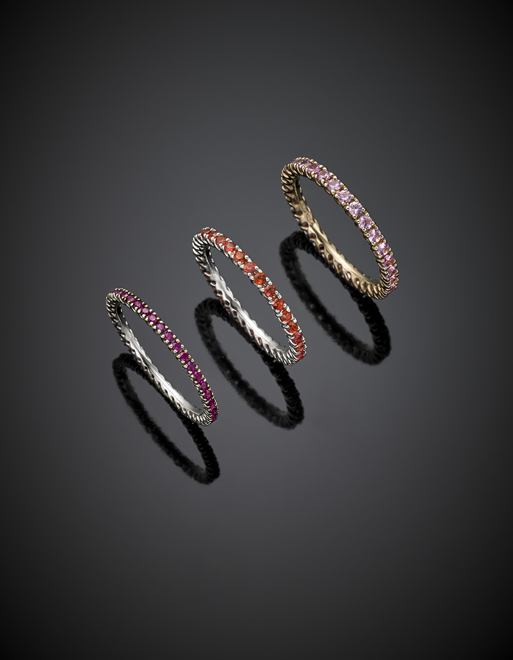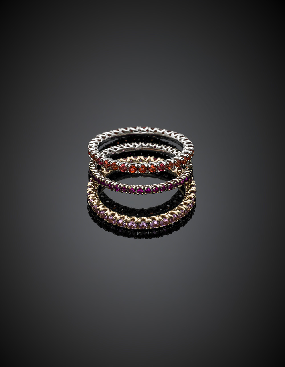 Lotto di tre fedine eternity in oro bianco con rubini, corindoni rosa e arancioni, complessivi g 4,12 misura 12/52. Garanzia originale