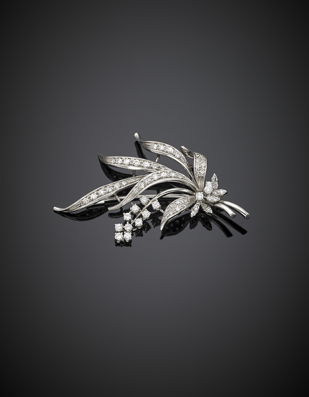 Spilla a tralcio fiorito in oro bianco e diamanti, g 12,47 e lungh. 5,80