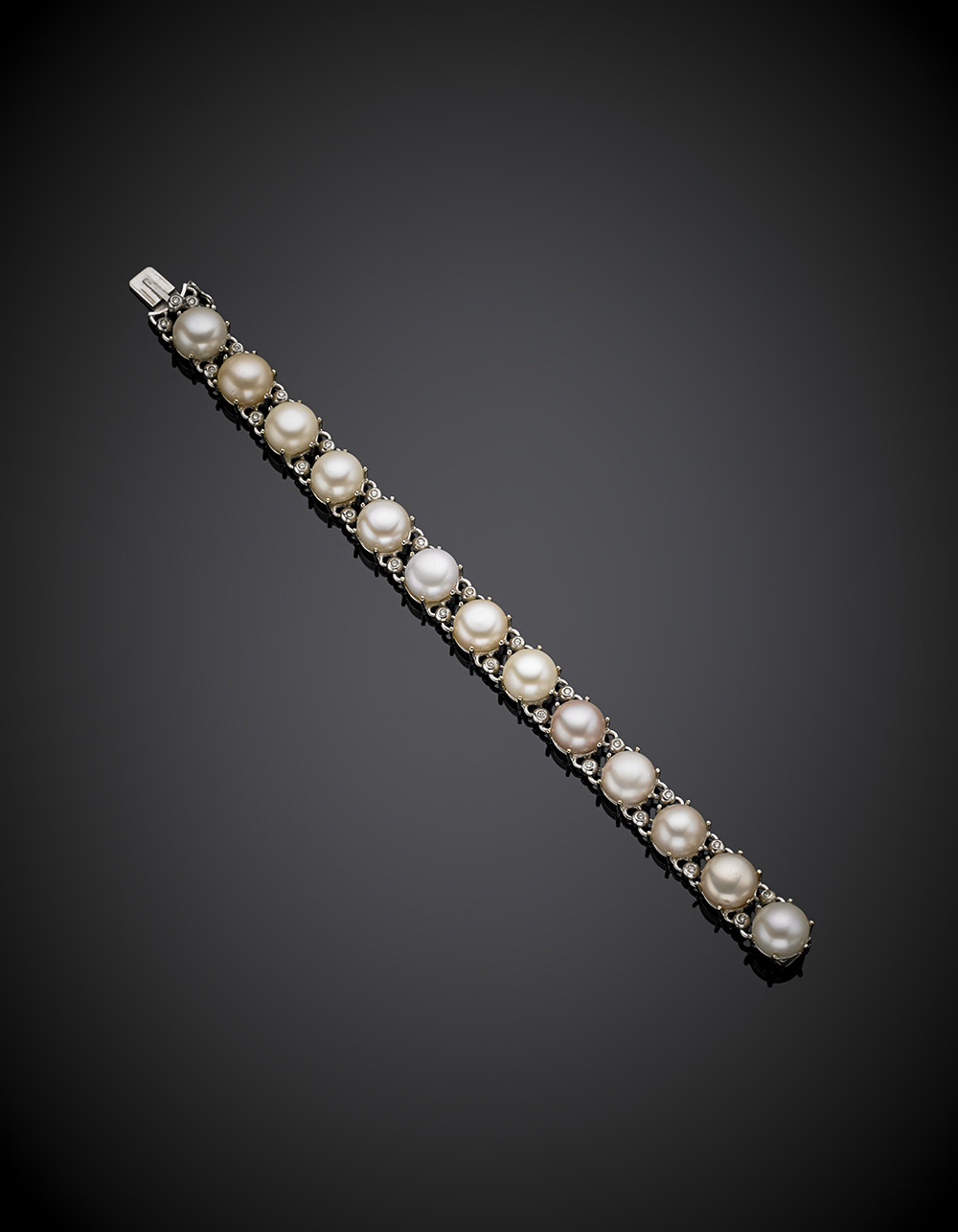 Bracciale in oro bianco snodato con perle a bottone di mm 10 circa,varie sfumature, rifinito con diamanti rotondi, g 36,19, lungh. cm 18 circa.