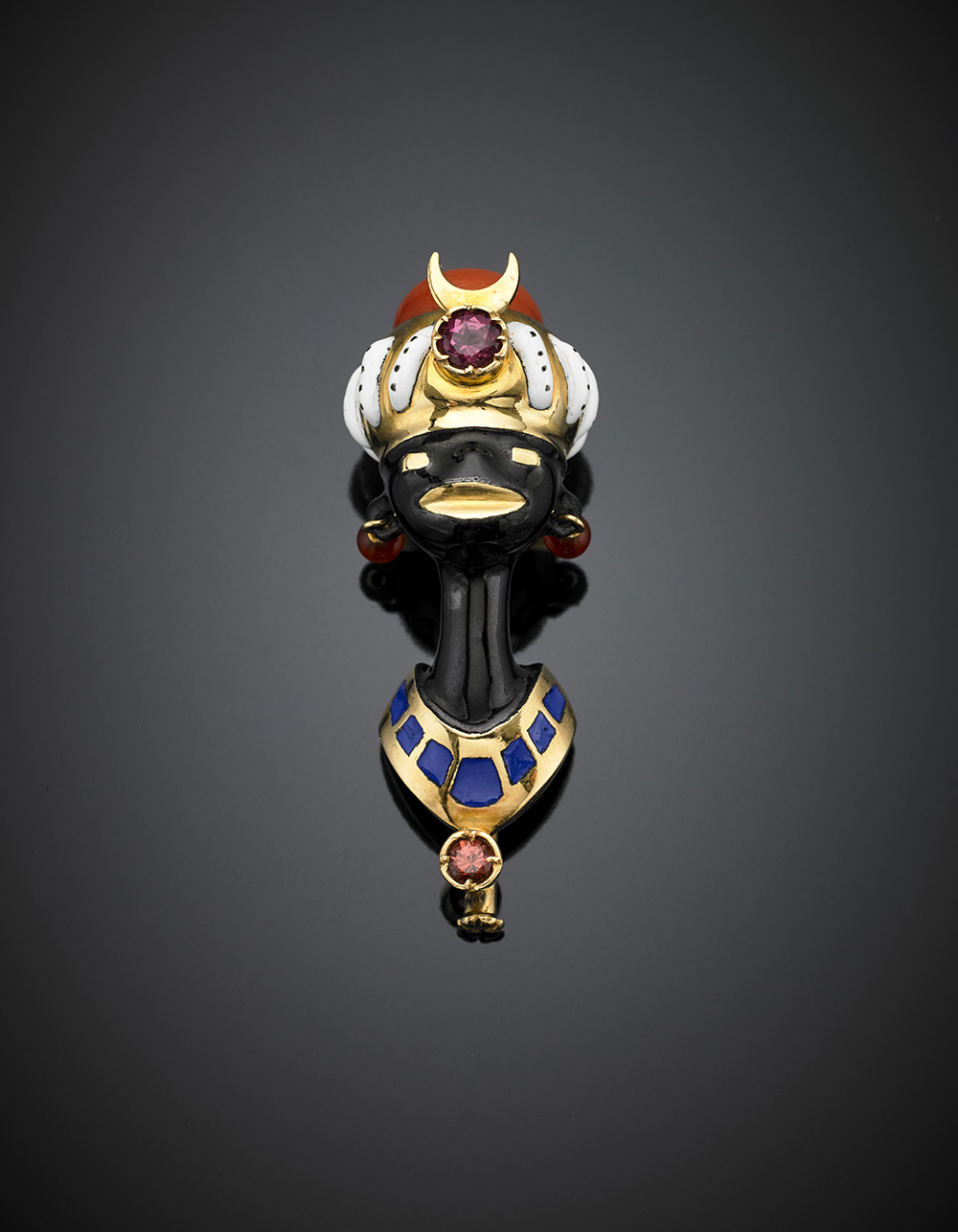 Broche a guisa di moro in oro giallo rifinito con smalti una ametista rotonda, un corallo cabochon ed altre gemme, g 13,11, lungh. cm 4,10 circa.